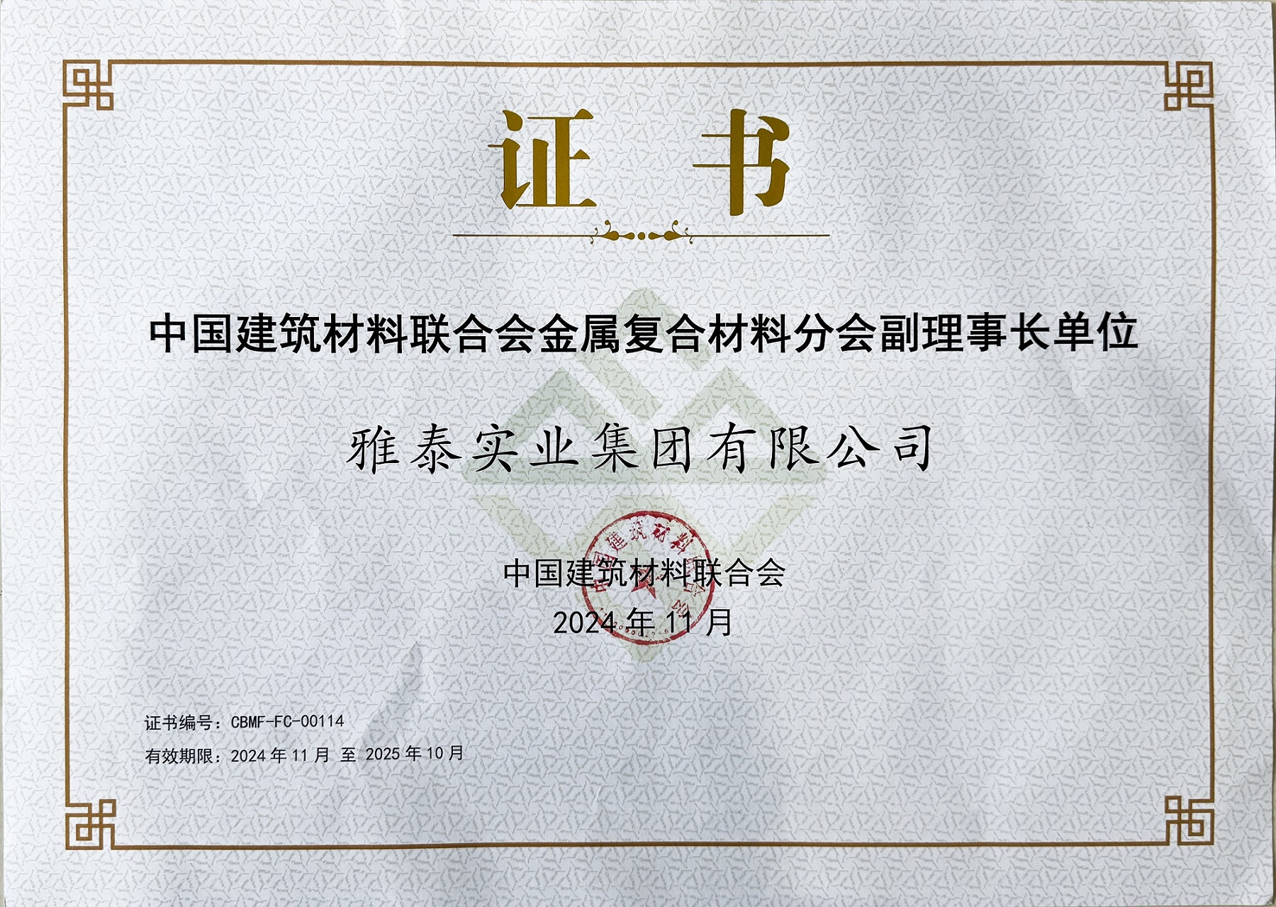 同時,雅泰實業(yè)集團作為幕墻行業(yè)優(yōu)秀的國內(nèi)老字號品牌,也長年擔(dān)任著中國建筑材料聯(lián)合會理事、金屬復(fù)合材料分會副理事長等角色。